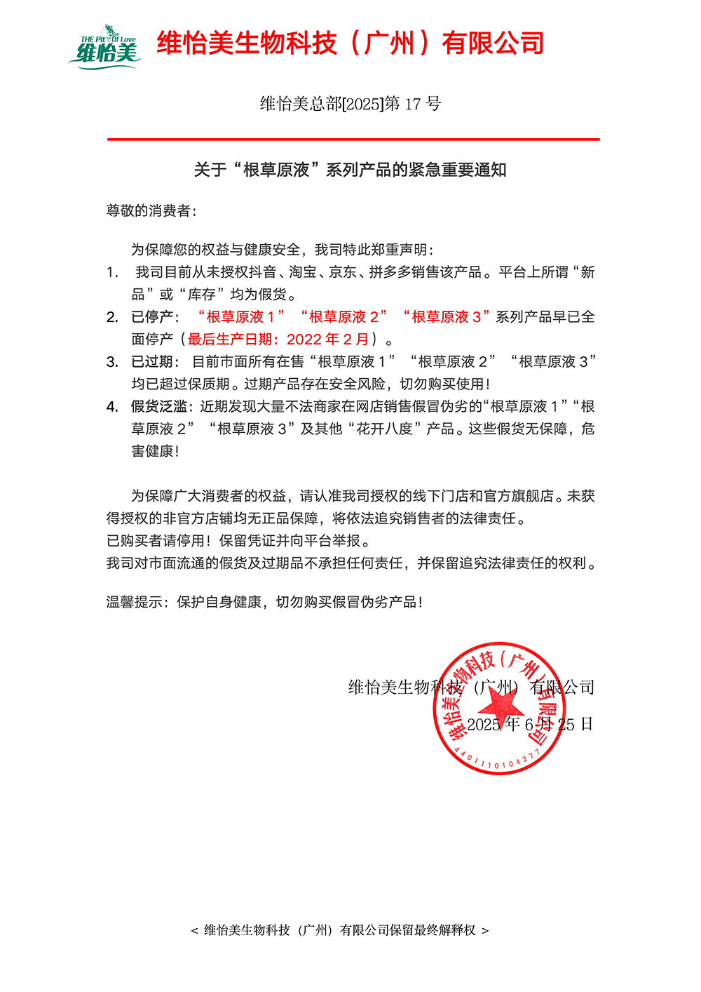 关于“根草原液”系列产品的紧急重要通知