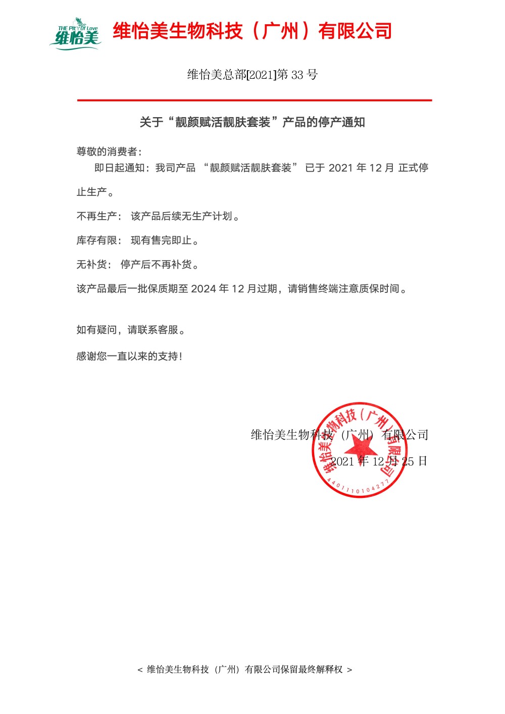 关于“靓颜赋活靓肤套装”产品的停产通知